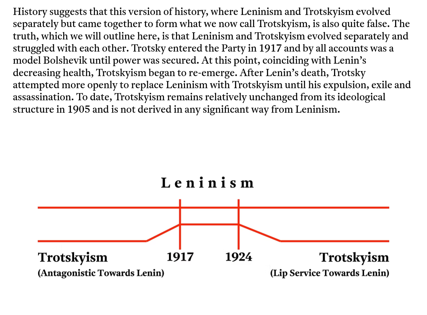 >That tendency as well has largely lost any singular meaning in the modern day, and today the common usage of the term is essentially meaningless and not actually connected to any concrete politic or criticism of one. The main reason for this is that revisionist "Marxism-Leninism" and Trotskyism have both convergently evolved to be essentially identical (hence why WWP and PSL are rarely ever called out for their blatant Trotskyism) and in agreement on the theory of productive forces, centering revolution in Euro-American industry as the main necessity, downplaying national liberation struggle, practicing entryism, and denying that the class struggle continues under socialism within the Communist Party, in particular denying the possibility of a new bourgeoisie emerging within the Party — "Marxism-Leninism" instead converging on Trotskys concept of a "degenerated workers' state." Those Trotskyists who haven't converged with "Marxist-Leninists" in theory and practice have done even worse for themselves and are essentially just social fascists, or just straight-up fascists in the case of the Socialist Workers Party USA.Wrong. Trotskyites are among principal enemies of working peoples because trotskyite deviation is mainstream in imperialist nations.