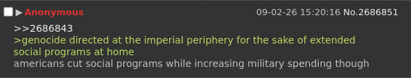 Does the 1st world bomb the 3rd world in order to extend their social programs, or does the 1st world bomb the 3rd world in spite of the fact that their increased military spending could go towards social programs instead? I see both narratives on here quite often and both seem incomplete and burdened by assumptions. Make sure to call me stupid and not answer my question.