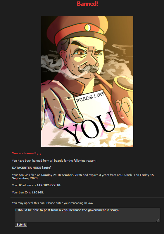 >>2690478>>2690485you're retarded. he is permabanned. he has been permabanned. he's using the tor node to ban evade, and when he's not doing that, he's just changing his IP address. you can't realistically permaban people from imageboards unless you disallow VPNs and tor node. But even then, there's ways around an IP ban.