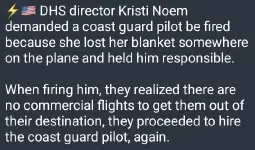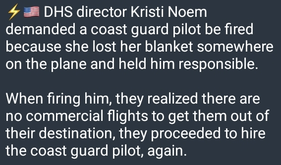 https://www.wsj.com/politics/policy/chaos-kristi-noem-homeland-security-f095ac95https://archive.is/O6wFYA Pilot Fired Over Kristi Noem’s Missing Blanket and the Constant Chaos Inside DHS>Kristi Noem knew she needed a reset. >It was two days after federal agents had shot and killed Alex Pretti, and Noem was facing fire from all sides. Even some inside the administration were pushing President Trump to remove her from her position for her handling of the chaotic immigration enforcement operation in Minneapolis and comments she’d made saying Pretti committed an act of domestic terrorism.>So Noem’s top adviser, Corey Lewandowski, messaged Trump’s pollster with a request: They needed to cut an ad to help her, according to two people familiar with the episode. The pollster, Tony Fabrizio, who worked on Trump’s 2024 re-election campaign, ignored the entreaty, the people said.