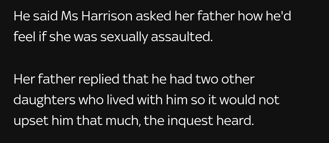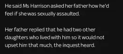 >A 23-year-old British woman who was shot dead by her father had argued with him about Donald Trump earlier that day, an inquest has heard.Lucy Harrison, a fashion buyer from Warrington, Cheshire, was staying with her father, Kris Harrison, and his family at their home in Prosper, Texas, in January last year. Ms Harrison's boyfriend, Sam Littler, who made the trip with her, told Cheshire Coroner's Court she would often become upset with her father when he spoke about his gun ownership.He said that on the morning of 10 January - when the couple were due to fly home - Ms Harrison and her father argued about Donald Trump."Kris and Lucy ended up having quite a big argument which led to Lucy running upstairs and being upset," Mr Littler said.He said Ms Harrison asked her father how he'd feel if she was sexually assaulted. Her father replied that he had two other daughters who lived with him so it would not upset him that much, the inquest heard.>Then, Mr Littler said, about half an hour before they were due to leave for the airport, Mr Harrison took his daughter by the hand and led her into his ground-floor bedroom.He said he heard a loud bang some 15 seconds later, before Mr Harrison started screaming for his wife, Heather. Mr Littler said: "I remember running into the room and Lucy was lying on the floor near the entrance to the bathroom and Kris was just screaming, just sort of nonsense."