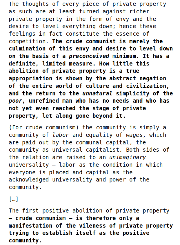 >>2692278Marx also made fun of bro for suggesting communism is when someone lives in austere,ascetic and highly disclipined artel where everyone has to share everything(unironic you will share your toothbrushism) and would write this while kicking bakunin out the international about Nechayev: