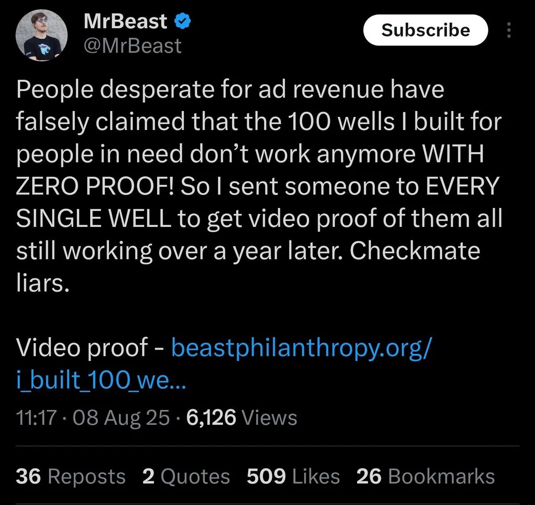 Mr Beast must stop trying to provide water to the poor regions of Africa. The temporary relief is tantamount to revisionist reformism. It acts as a controlled pressure valve, which prevents the organic centralisation of the Sub-Saharan proletariat into recognising and acting out spontaneously the invariant programme of the historic party of the real movement.