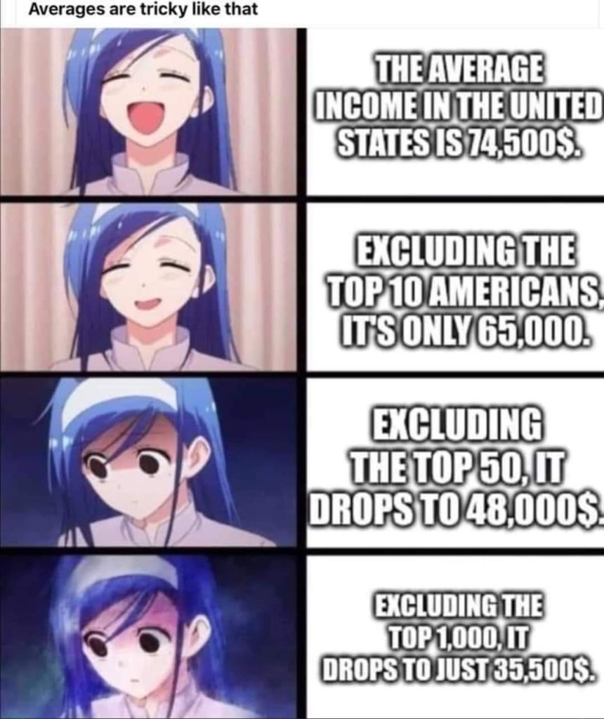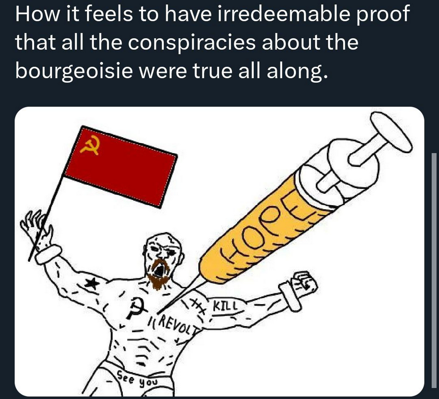 >>2696417the sad issue about that picture is that the average 35k a year wishes to be the top 1000 richest people. the state tells them 'yes, you can', but that's bs, the top 1000 richest people are basically clans with inherited stolen wealth, slave owner rich people, and obtained through exploitation from slavery first then through capitalism and the tools capitalism uses to extract that precious surplus out of the pocket of the workers. the failures of the communists and socialists in the US was to never engage in teaching to the 35k a year people the key aspects of the impossibilities of that to happen.