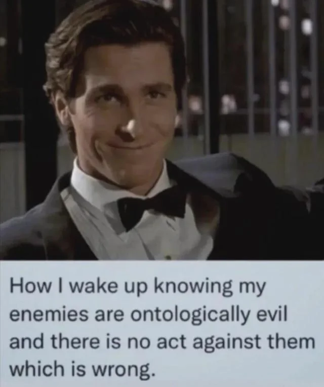 >>2696466their answer would be to the effect of "because you are perpetrating all the things that you are lying about being opposed to." it's a pretty neat little rhetorical bow they've tied altogether imho. it's ridiculous, mind you, but it has force.