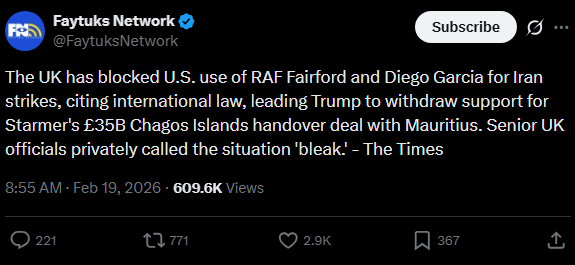 >>2696442That's old news. The Trump administration already approved the deal and transfer to Mauritius, then Trump tweeted that dumbshit randomly, during the Davos Summit when the Greenland drama was ongoing. Now the Trump administration have explained to king retard that they know what the fuck they're doing and to stop tweeting random shit, and now the deal is once again endorsed by the Trump administration.