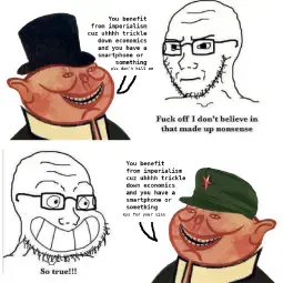 You keep flip flopping between bourgs lying to westerners that imperialism doesn't exist because then the oh so noble westerners would stop doing it, and saying that telling them that imperialism benefits them would make them immune to further reasoning
