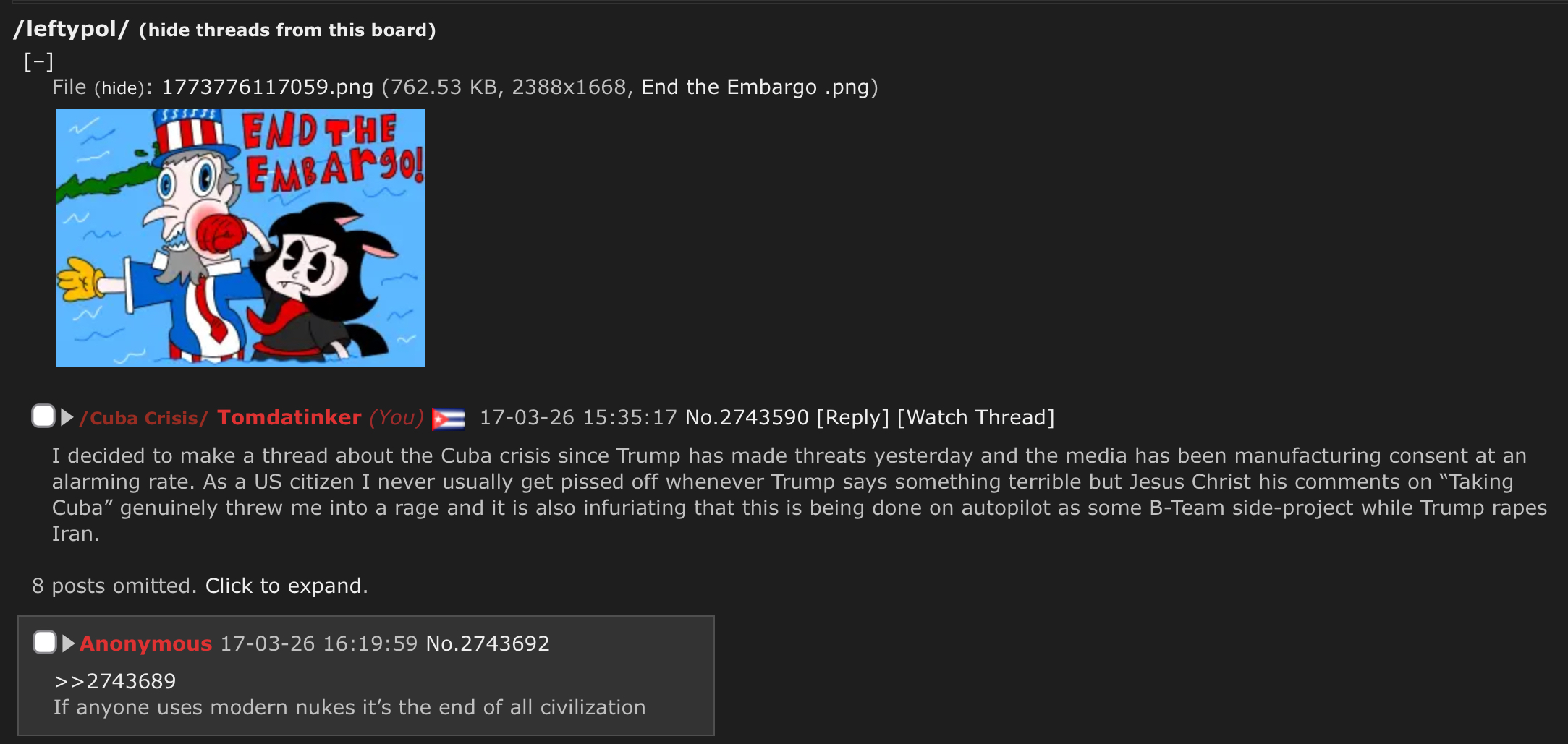 Local transportation, services, and obviously healthcare is being restricted. And considering Cuba does more for the global south in heathcare then literally any western country, it tells you how much this really effects the world, not just the nation itself. As of writting this thread Russia is sending a humanitarian ship to Cuba, do we think the US is gonna stop the ship?