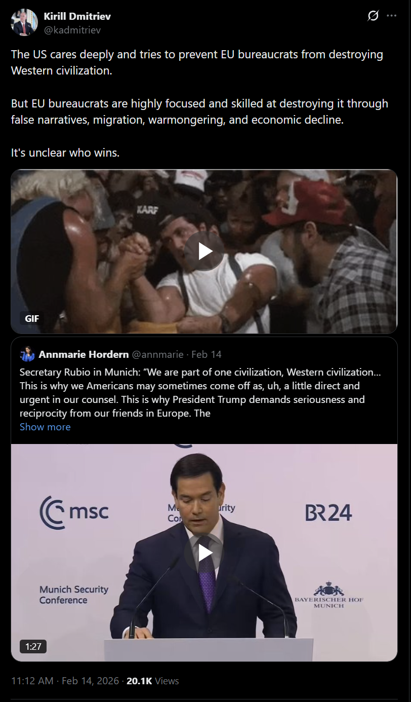 >>2703929>And this will happen when?I think it already has. At least if you follow the propaganda narrative from RT, it has taken a much softer line towards the U.S. while taking a harder line towards Europe. So there's something about the U.S. government's general approach that the Russian government sees as at least compatible with their own vision of the how the world should work. Also here's Russia's special envoy for economic investment and the CEO of the Russian Direct Investment Fund.