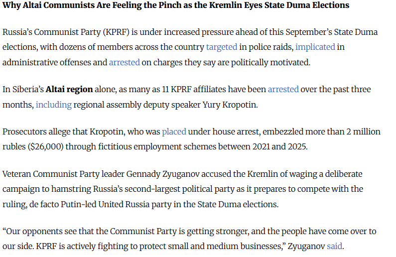 <Kizaket (Regional Political Analysis): "В Алтайском крае вернулись к предвыборному 'делу КПРФ'" (In the Altai Territory, they returned to the pre-election "KPRF case"). This article explicitly outlines how the security apparatus is dismantling the KPRF apparatus ahead of the elections. It also confirms Gennady Zyuganov’s direct appeals to Alexander Bastrykin (head of the Investigative Committee) to stop the persecution of his deputies.Link: