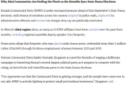 Parliamentary elections will be held in Russia in September, and as they approach, dozens of Communist Party members have been arrested. In the party's stronghold in the Altai region of Siberia, 11 party members have been arrested over the past three months. Among the arrested is Yuri Kropotin, deputy speaker of the regional parliament.