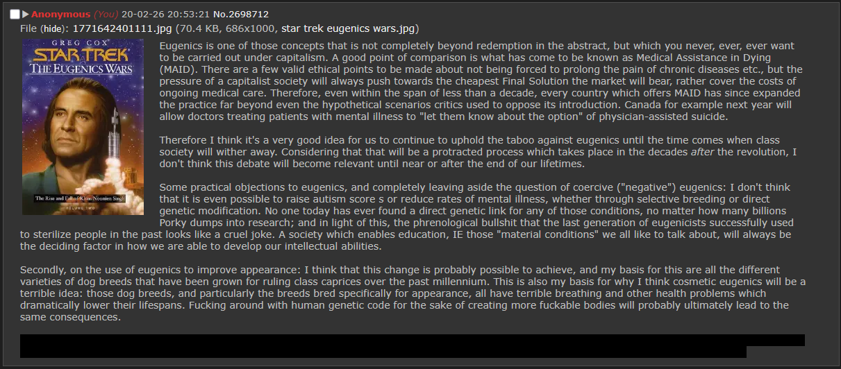 >>2704065We don't live in a world of ideas, we live in material reality. So execution is what matters, and eugenics has and always will be executed in the worst matter possible by the worst people possible.