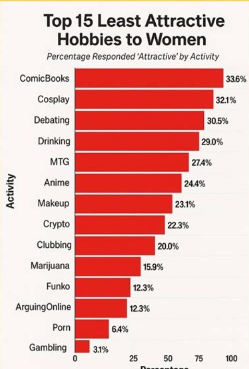 >Porn second lowestIt would be interesting to see this study done again, but asking men what the least attractive hobbies are in women. Because while only a tiny minority of men spend more than an hour a day consuming porn, there is a thriving subculture of women who spend hours a day reading nothing but smutty, lurid, deniably sadomasochistic "romantasy" novels. I'm not sure whether that would be seen as a positive ("she'll be a freak in bed") or a negative ("I'll never live up to his (literal) monster cock") to most men. It would be a negative for me.