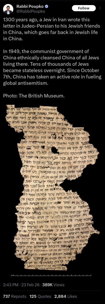 <Overthrowing the West’s Global Order<9. A Project to Overthrow the West’s Global Order: Kevin Rudd’s (former Australian prime minister) 2024 book, On Xi Jinping, concludes from Xi’s own statements and policies that his true long-term aim is to overthrow the established global order and replace it with a new China-centered system supported by the “Global South.” If this is so, Muslim countries would form the largest single bloc in this new, imaginary order. As the Jewish people and Israel are an integral part of the West, their place in the “new” world order would be greatly reduced. In China’s “Global South” fantasies, the Jew/Israeli could become a fading symbol of the old, moribund order. If Rudd is right, maybe Chinese antisemitism aims at anticipating or even promoting this outcome. Today, China is the only credible initiator of an overthrow of the global order. The only other candidate, though not yet a credible one is radical Islam. The United States, the status-quo superpower, is sending mixed messages.<China is the only country with a credible plan for a radical change of the global orderSome interesting stuff in there