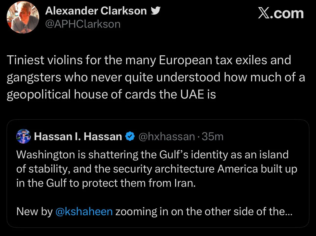 Meanwhile look at footage from Qatar or the UAE where the local Arabs scream "oh my god!!!" in some weird broken American English.