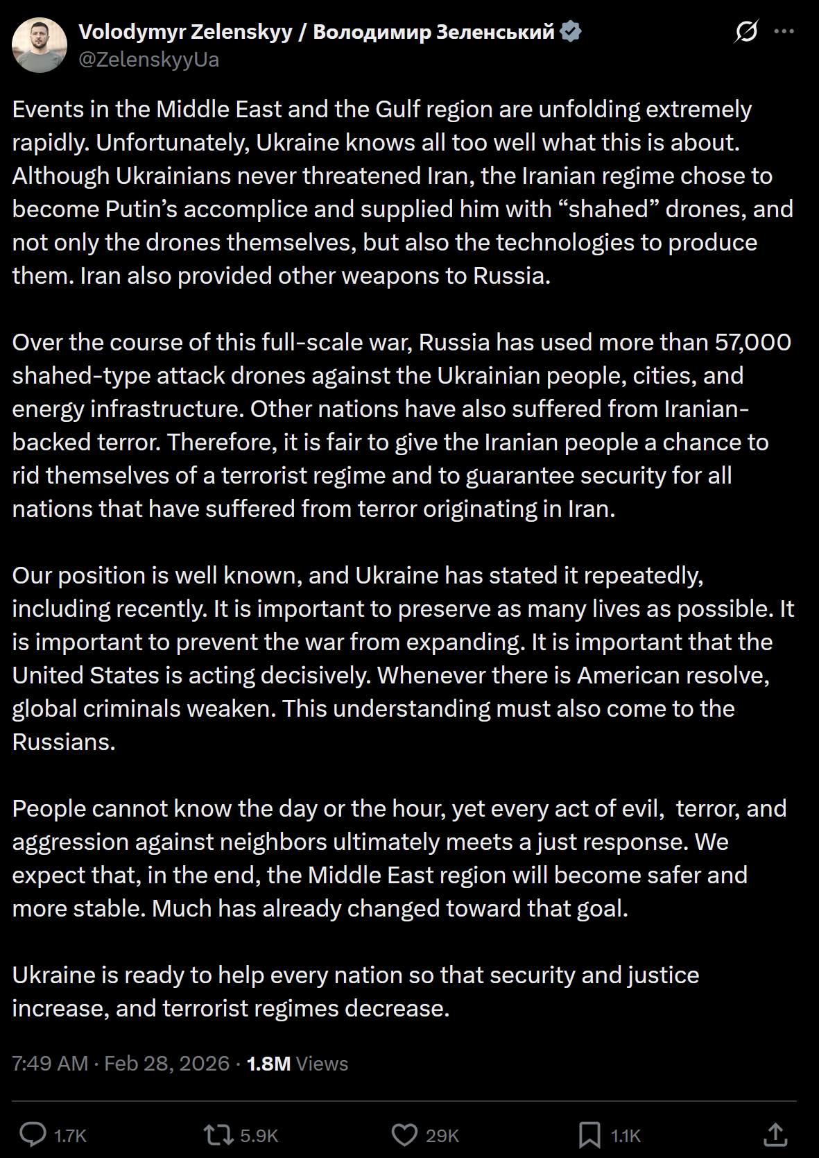 >“Other nations have also suffered from Iranian-backed terror. Therefore, it is fair to give the Iranian people a chance to rid themselves of a terrorist regime and to guarantee security for all nations that have suffered from terror originating in Iran,” Zelensky added.