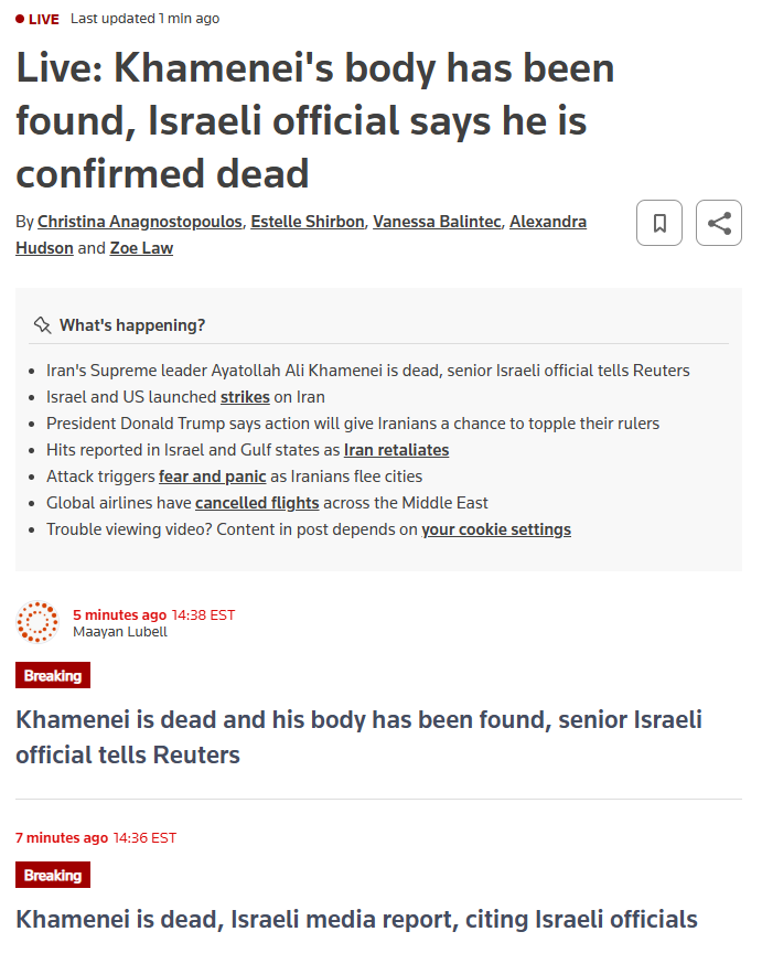 >Khamenei and a couple of Iranian generals are (supposedly) dead