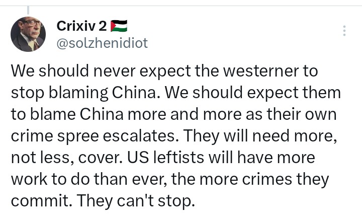 I think China could do a lot more against the US and the Zionist colony, not just to prevent the torture and death of kids, but for its own political goals, which are ultimately better than the West's. Iran is a strategic ally, and leaving them to fend for themselves is completely brain-dead. Letting Zionists continue pushing Western interests in the Middle East through genocide just for small economic trading gains is incredibly retarded. You don't need a master's degree in Marxism to realize that failing to back ideological allies in your hemisphere is a massive strategic failure. It is the exact reason the US was able to dominate Latin American countries.