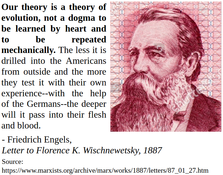 <Our theory is a theory of evolution, not a dogma to be learned by heart and to be repeated mechanically. The less it is drilled into the Americans from outside and the more they test it with their own experience […] the deeper will it pass into their flesh and blood. When we returned to Germany, in spring 1848, we joined the Democratic Party as the only possible means of getting the ear of the working class; we were the most advanced wing of that party, but still a wing of it. When Marx founded the International, he drew up the General Rules in such a way that all working-class socialists of that period could join it – Proudhonists, Pierre Lerouxists and even the more advanced section of the English Trades Unions; and it was only through this latitude that the International became what it was, the means of gradually dissolving and absorbing all these minor sects, […] Had we from 1864, to 1873 insisted on working together only with those who openly adopted our platform where should we be to-day? I think that all our practice has shown that it is possible to work along with the general movement of the working class at every one of its stages without giving up or hiding our own distinct position and even organisation […]Friedrich Engels, Letter to Florence Kelley Wischnewetsky, January 27, 1887