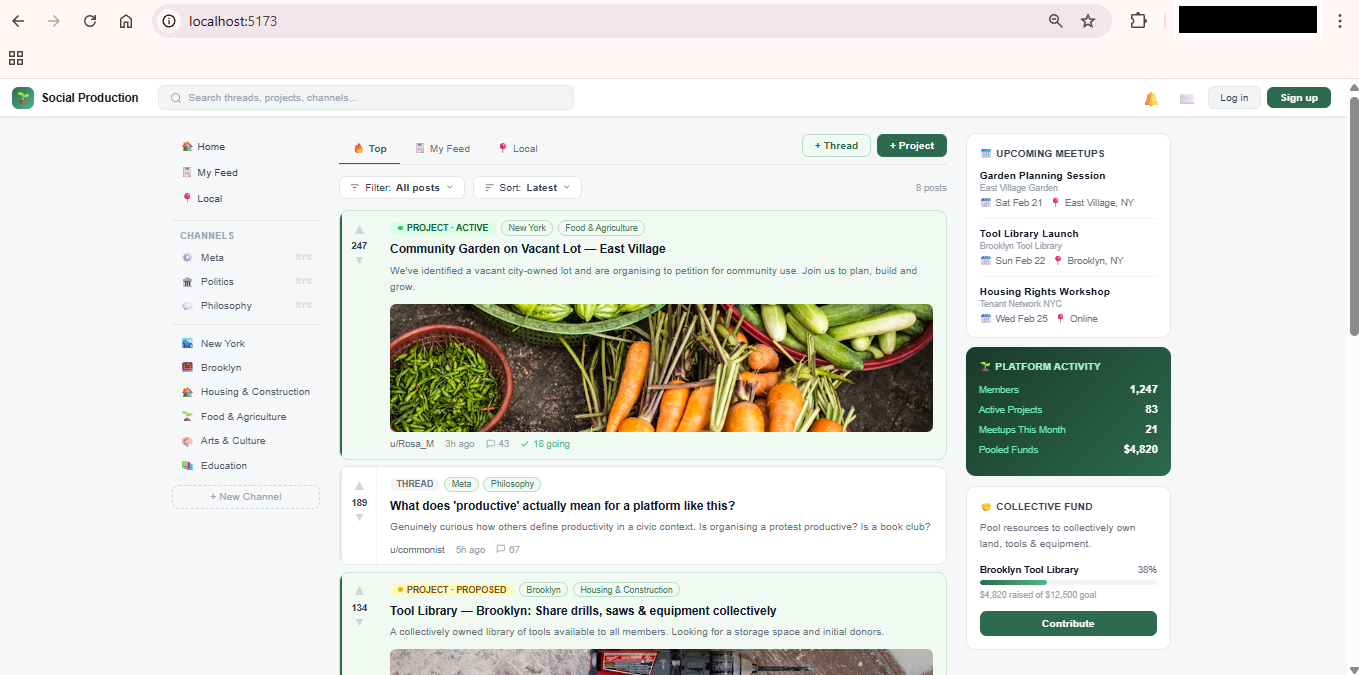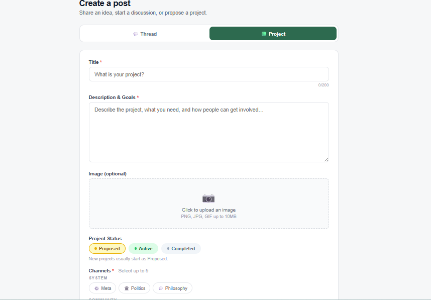 Okay so basically think of the platform as a place where users can create threads for discussion, or "projects". Projects are public discussions/groups with the idea being to produce something. users tag the thread/project by channel/s, channels are user created and could be based on location, sphere of production etc.