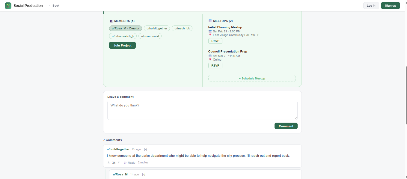 You could make a project for example to create a community garden, people are free to join, signal interest, discuss a plan for production, plan for distribution. once plans have been established and selected via polling of members, actual meetups of activity are planned.