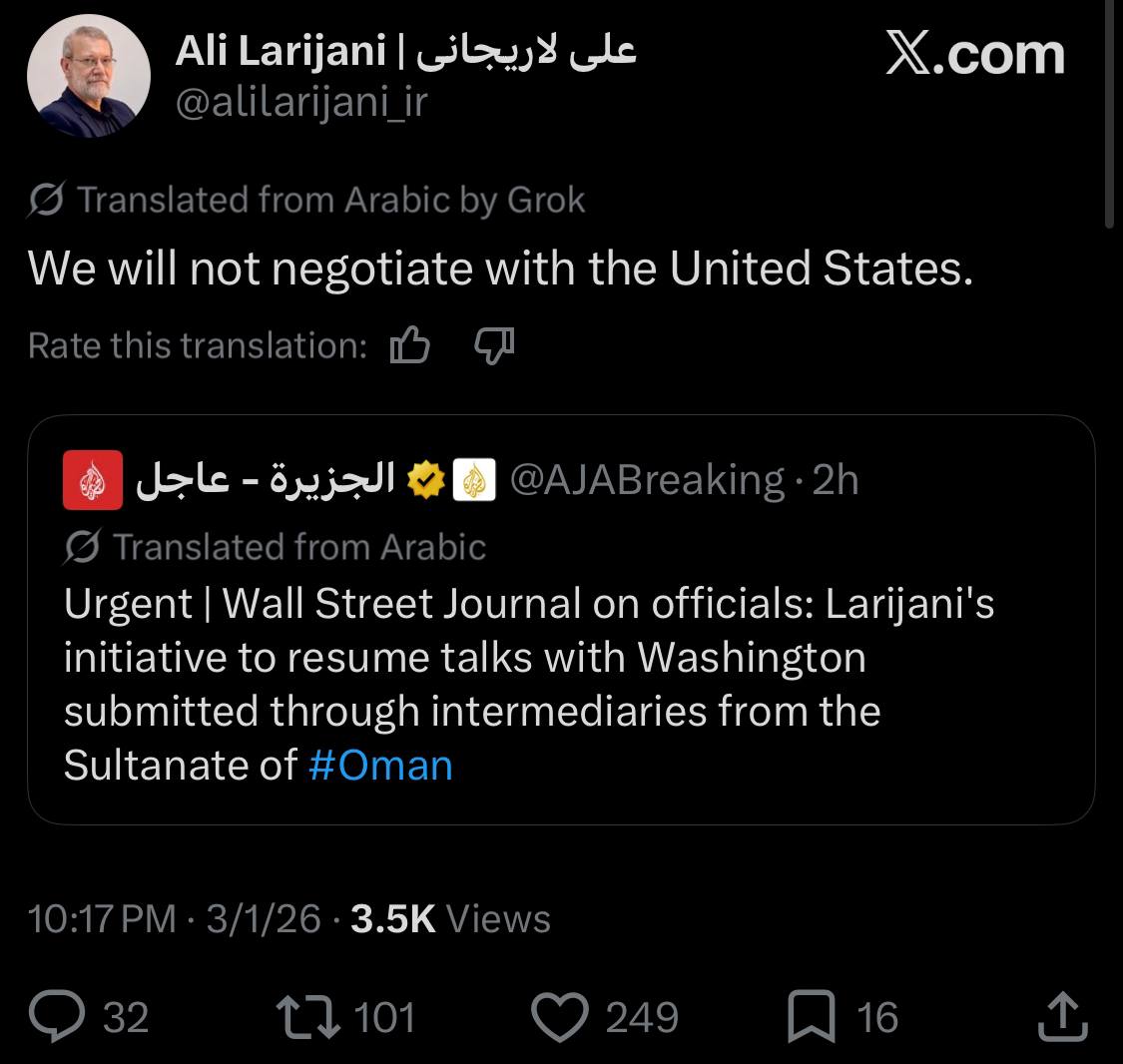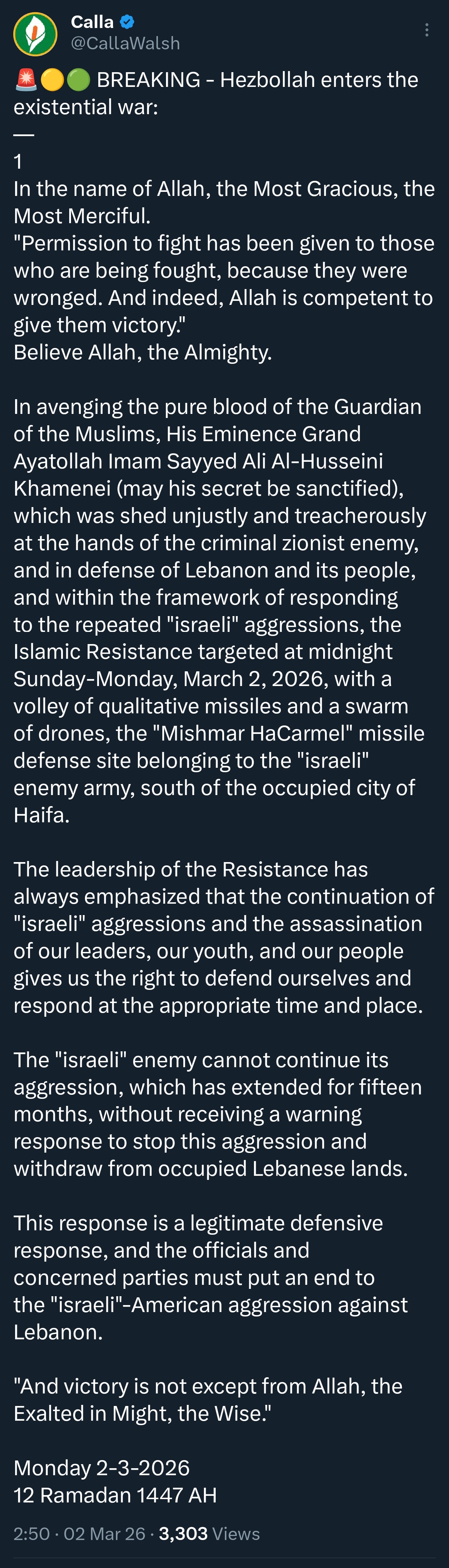 >>2713558>That's what the SMO was supposed to be to lmao, except the imperialists have not achieved any of their goals in Iran. It's obvious by this point that their primary goal was to cause the collapse of the Islamic Republic with a short, rapid military intervention. Failing that, they were hoping that after taking a beating, the Iranians would be both incapable of resisting and willing to negotiate. None of that has happened. I wouldn't count your chickens yet. I've heard a theory that Trump wanted this to be over by Monday before the stock market crashes (well that plan is busted, if true), but there's another theory that the plan is to go on for weeks and modeled on Milosevic in Serbia in 1999 in which the U.S. bombed them for 78 days i.e.