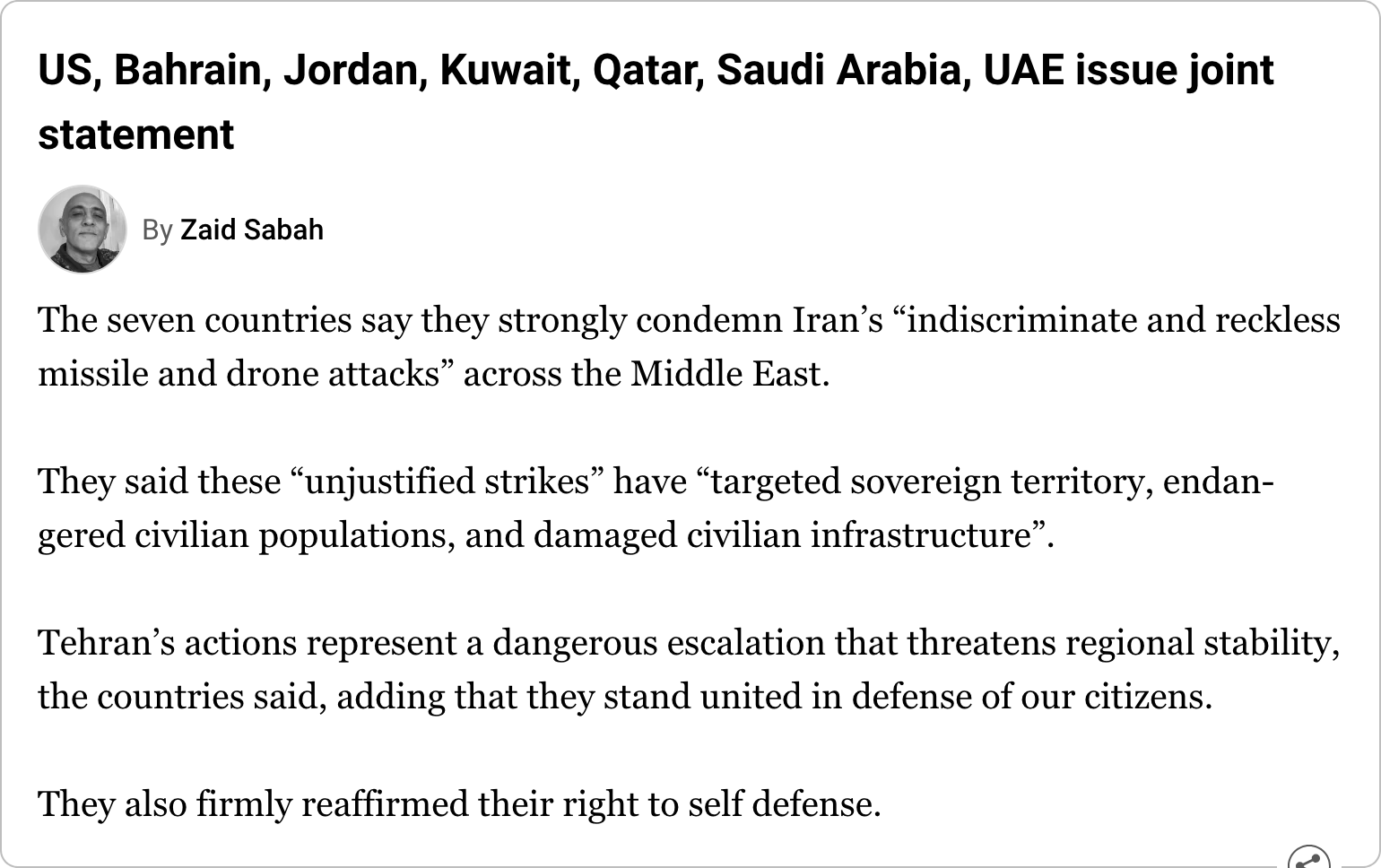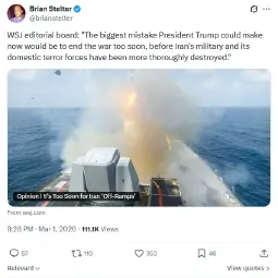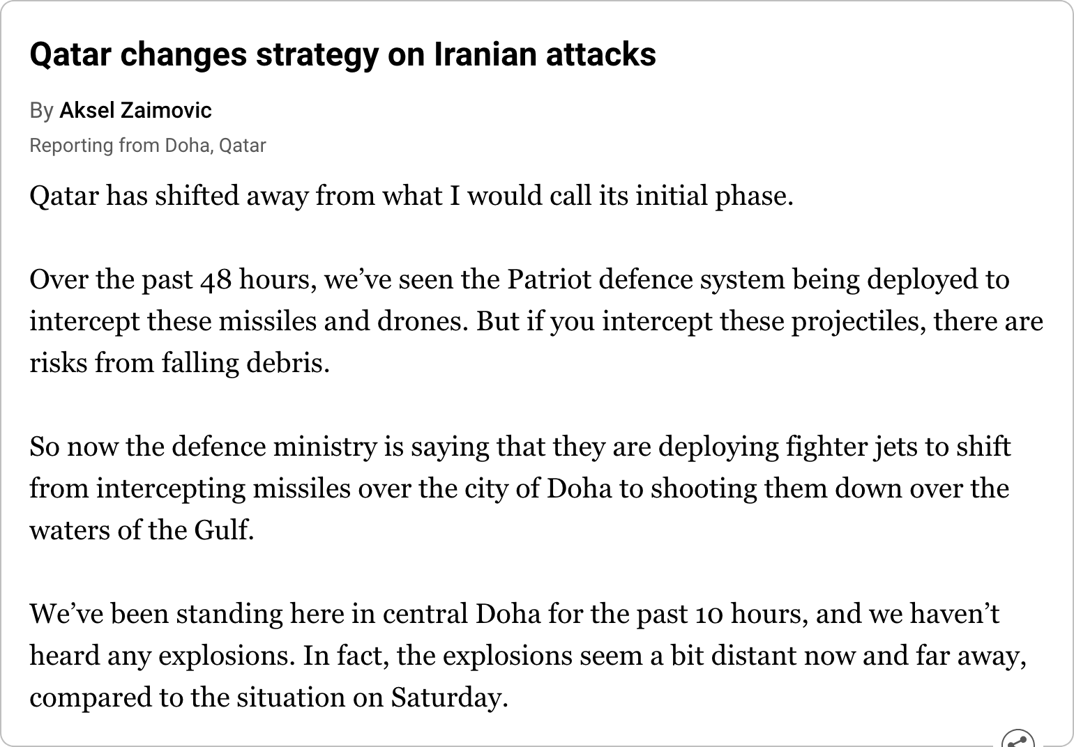 Also, the U.S. and Israel have destroyed missile launchers. But there are missile stockpiles and production facilities which have not been destroyed. They're in mountains. So I don't think Iran is just going to run out of them in a week.
