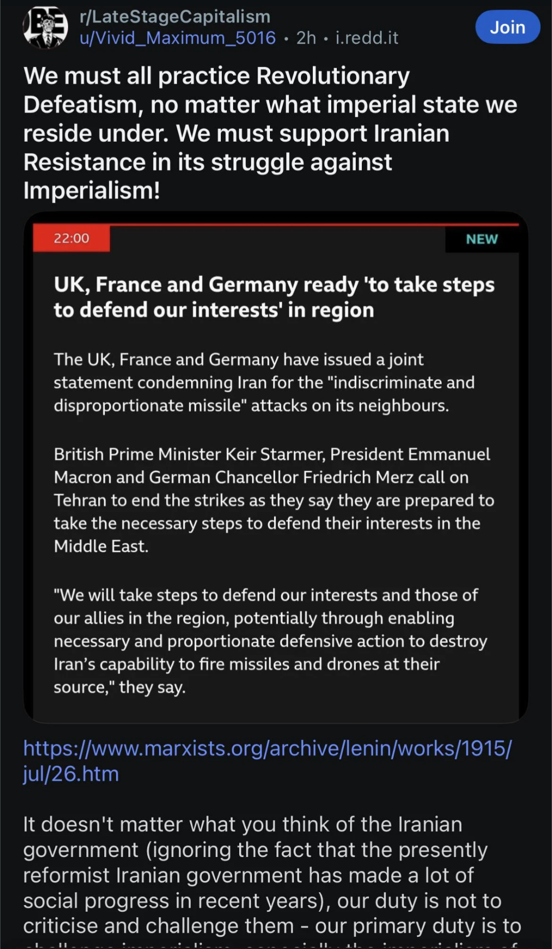 >>2713737Good post. I refuse to indulge performative targets this time. The only way Iran restores deterrence and stops this happening every six months is either building the bomb or showing that American/Israeli leaders will be targeted.