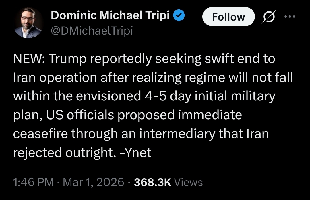 Now Trump's best case scenario is that the US loses Israel by exiting the region, worst case is the US ceases to exist as runaway spending on their bloated armed forces and internal conflicts rip their empire apart.