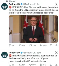 British Prime Minister Keir Starmer announced that the UK has approved a US request to use military bases in the UK for “limited and defensive” operations targeting Iranian missile depots and launch sites.