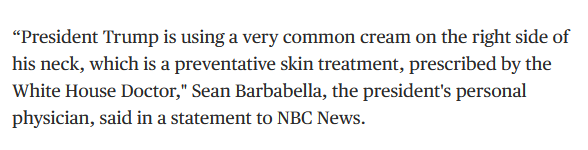 >>2714746Trump's hand bruise looked like the result of repeatedly setting and removing an IV. This one on the neck looks like a rash from the adhesive on a neck IV.