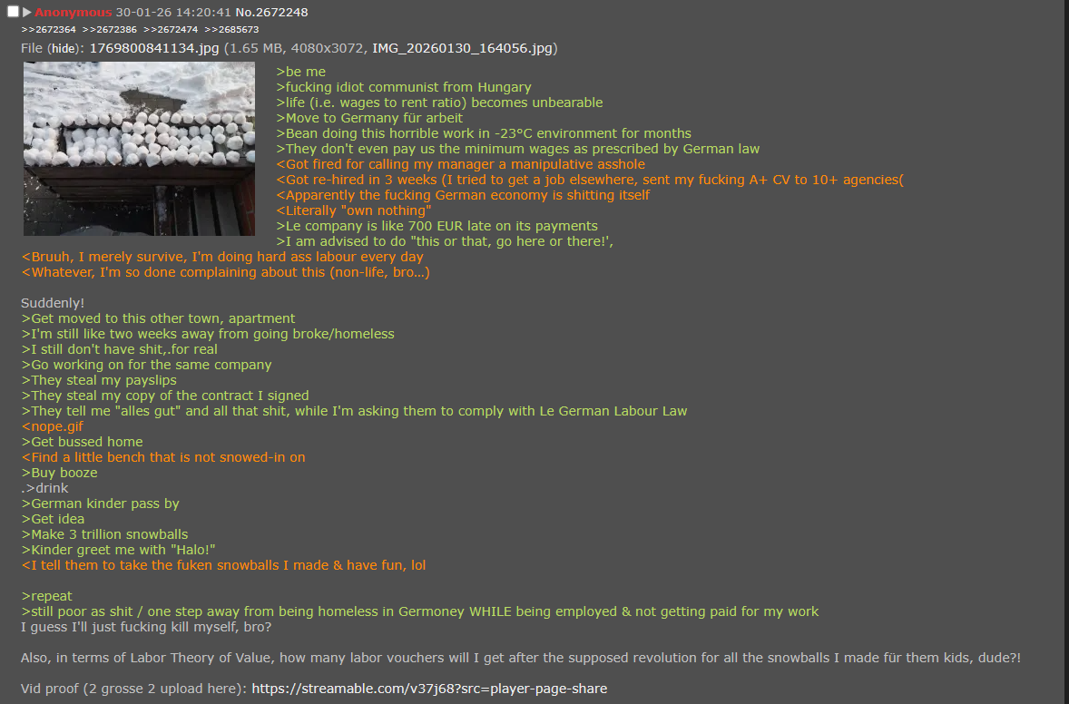 >>2713397Migrant worker from Eastern-Europe in Germoney. Order-picking in a -23°C warehouse. I'm dying in here.