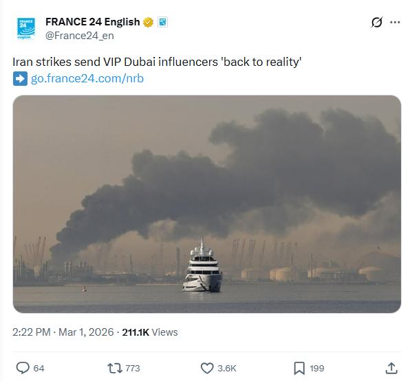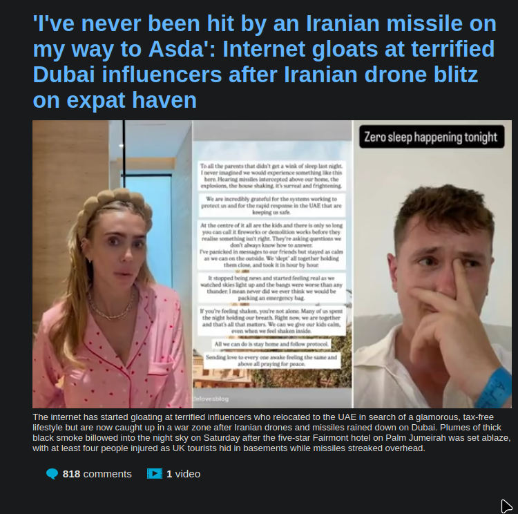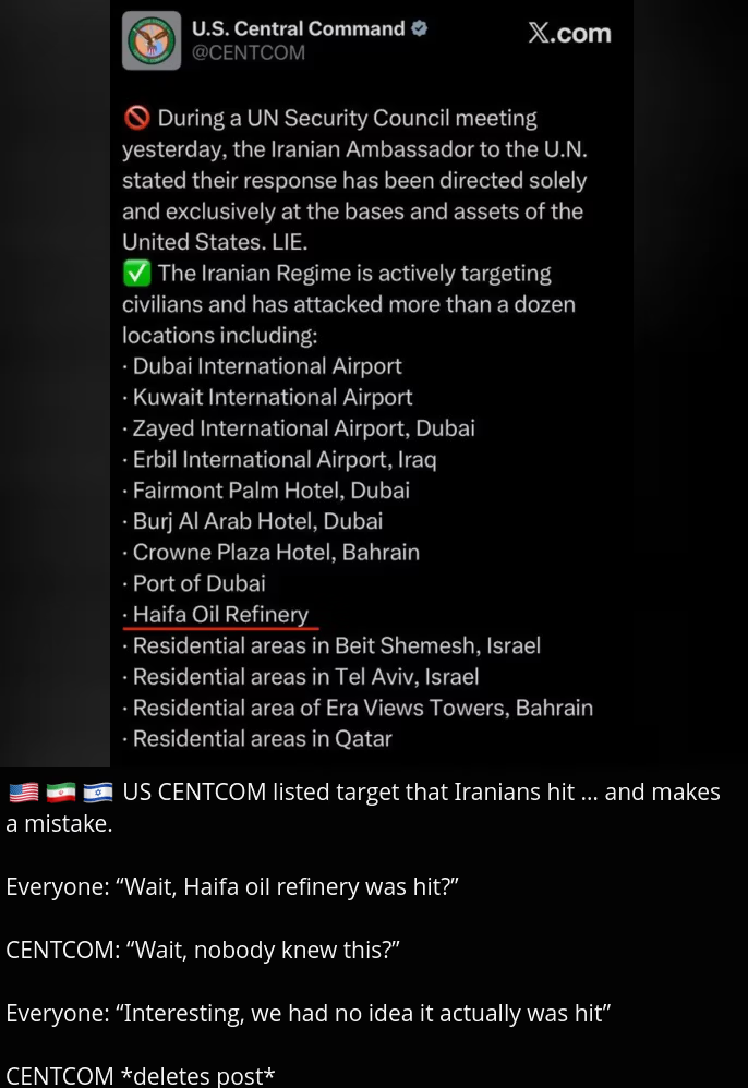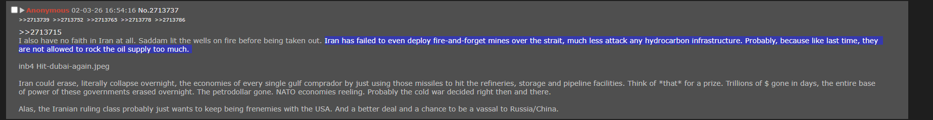 >180 thousand barrels of gasoline per day.>25 thousand barrels of plane fuel per day.>25 thousand barrels of natural gas liquid per day. >>2713889You're downplaying pretty hard. Iran barely touched the gulf states last time beyond token hits on US bases. Now they're directly targeting Dubai and destroying its economy. Dubai's airport is currently closed and offline from Iranian strikes, and its tourism(and prostitution) industry is like their entire GDP. Shias in Bahrain are revolting against their oppressive Sunni US-backed dictatorship and Americans can't do shit about it due to being bogged down protecting Israel.
