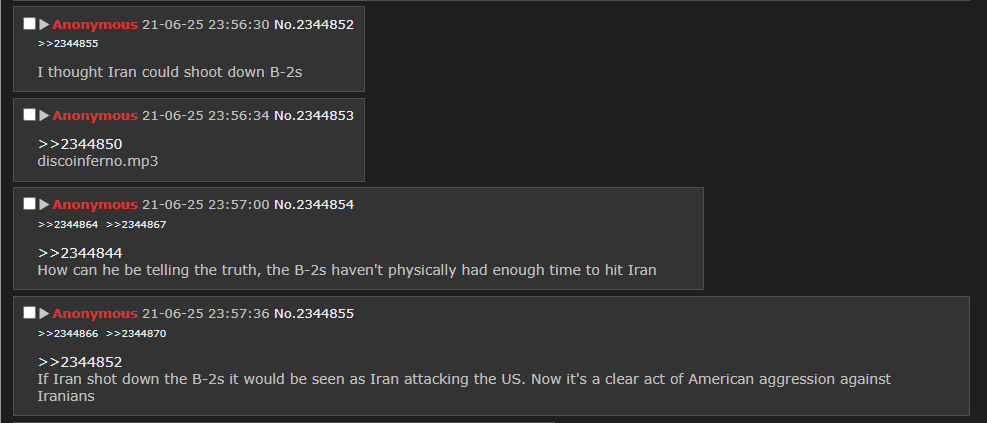 >>2713874>This bombing campaign will last a few weeks until Iran is forced back to negotiation table.Same thing as last time. Performative, non-bridge-burning targets instead of giving Bibi/Trump a taste of their own medicine.