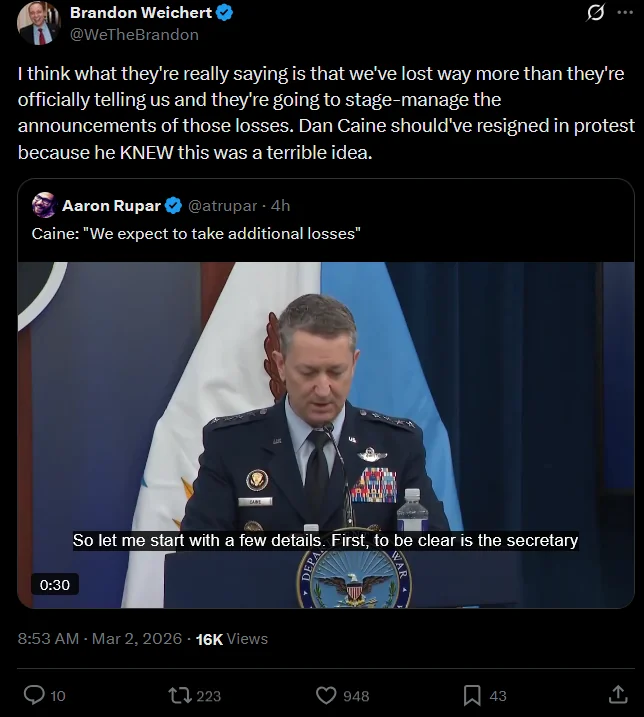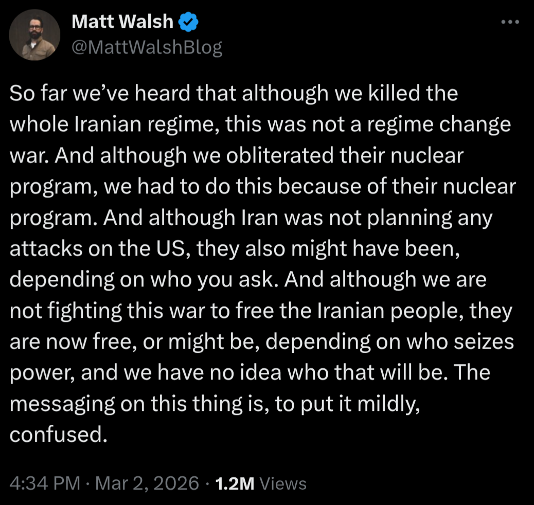>>2714813>>2714838He hasn't suddenly developed a conscience and is opposing the war, he's just bitching that the bosses screwed up his marching orders so he doesn't know which talking points he should be regurgitating to the base.