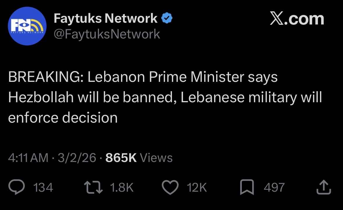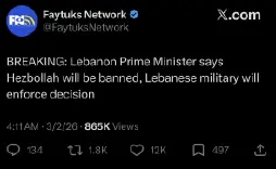 Following a cabinet meeting, Lebanese Prime Minister Nawaf Salam announced a total and immediate ban on Hezbollah's military and security activities and called on Hezbollah to hand over its “illegal” weapons to the state and remain a political party.