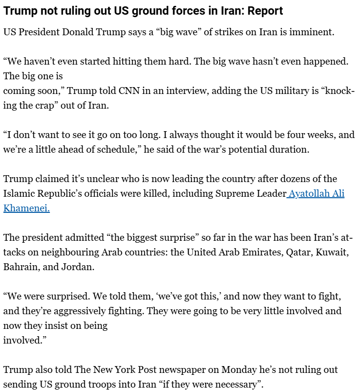 In an interview with the New York Post, US President Donald Trump stated that he did not rule out the possibility of American troops being on the ground in Iran. Trump said, “Just as every president has said ‘there will be no troops on the ground,’ I don’t hesitate to say ‘we will have troops on the ground.’ I say ‘we probably won’t need them’ or ‘if necessary.’”