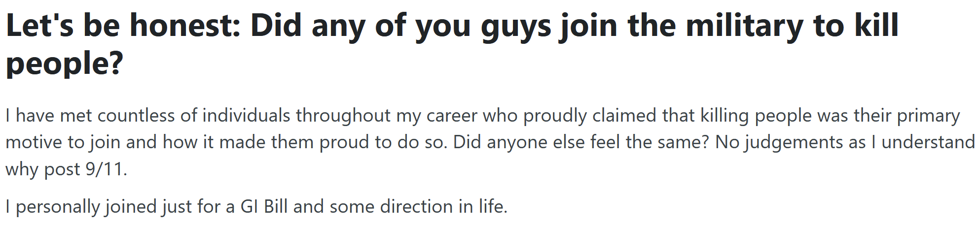 >>2715335Anyone got that video from a couple years ago where it was a bunch of soldiers, in some kind of dress uniform, maybe they're from a military academy, think they were waiting to get on a bus. Some guy was asking each of them why they joined, and a lot of them said "Because I want to kill people."