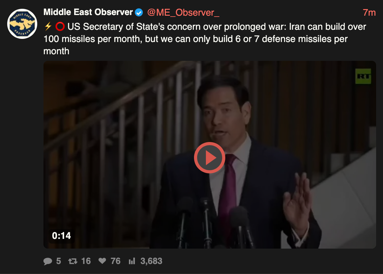 >Important Links:https://www.flightradar24.com/https://www.marinetraffic.com/en/ais/home/centerx:52.7/centery:26.8/zoom:7https://www.defconlevel.com/https://oilprice.com/https://www.pizzint.watch/https://eam.watch/https://www.gmcmap.com/index.asphttps://firms.modaps.eosdis.nasa.gov/map/#d:24hrs;@54.2,31.0,7.1zhttps://globe.adsbexchange.com/