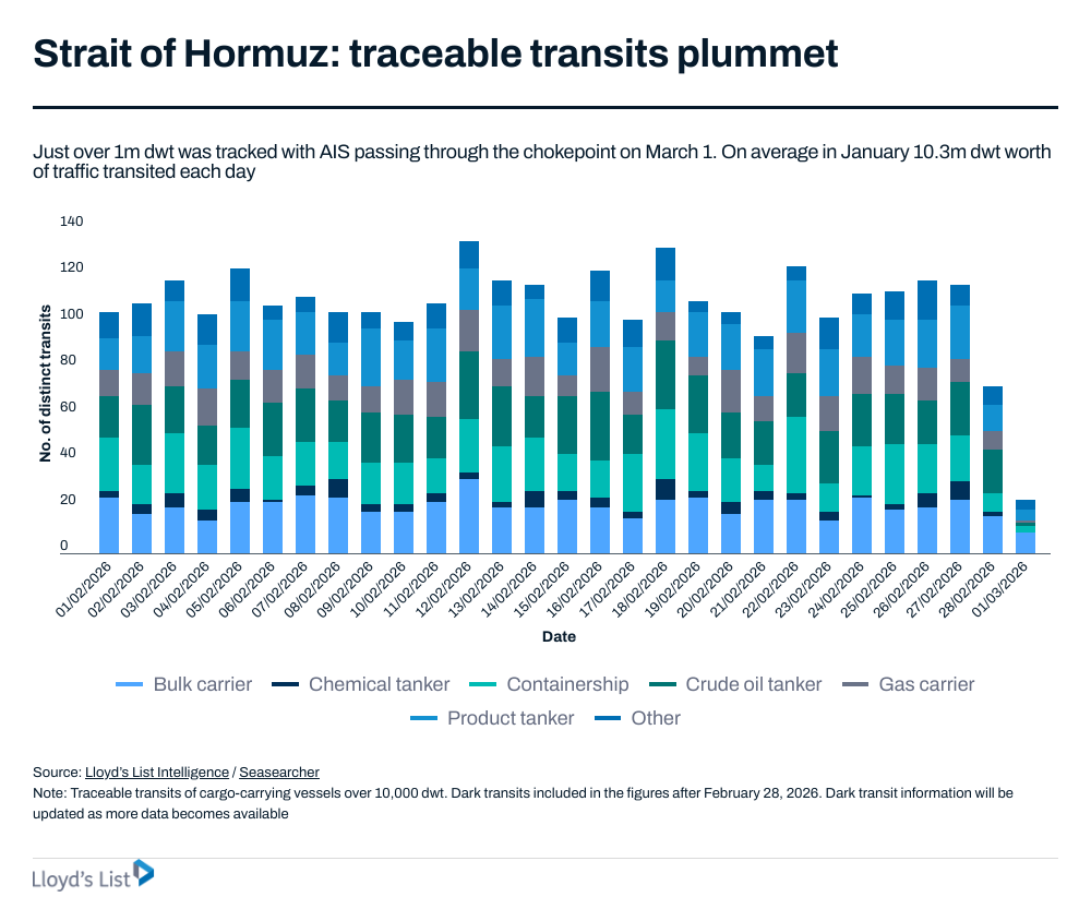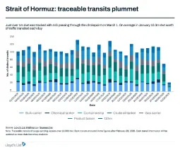 The Strait of Hormuz handles roughly one-fifth of the world’s traded oil and significant volumes of liquefied natural gas exports from Qatar and the United Arab Emirates. About 20 percent of global daily oil consumption — roughly 20 million barrels — passes through the narrow corridor.