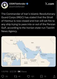 >>2714784>On Saturday, the elite paramilitary force said it closed the waterway, which is vital for global oil-and-gas shipments, after the start of US and Israeli attacks.Lying as always. Iran closed it for those who support aggression against Iran. China is still receiving it's oil freely.