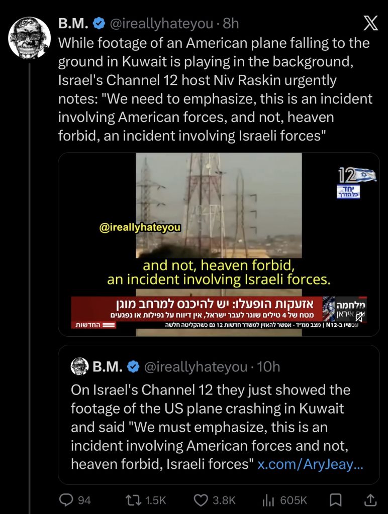 >That said, if friendly fire was the case we can point to how the West mocked and ridiculed Russia for its supposed lack of IFF (Identify Friend Foe) systems, when Russian ADs occasionally shot down their own assets in highly contested air spaces. But even Russia has never managed to humiliate itself with three lead aircraft shoot-downs in the same hour, let alone the same day. It’s clear that once again we find everything the West mocked Russia for over the past few years the West itself finds difficult in time of a real shooting war.>Recall how superior US’s IFF systems were said to be, now suddenly it quickly turns to “Well, we always knew IFF wasn’t reliable…”