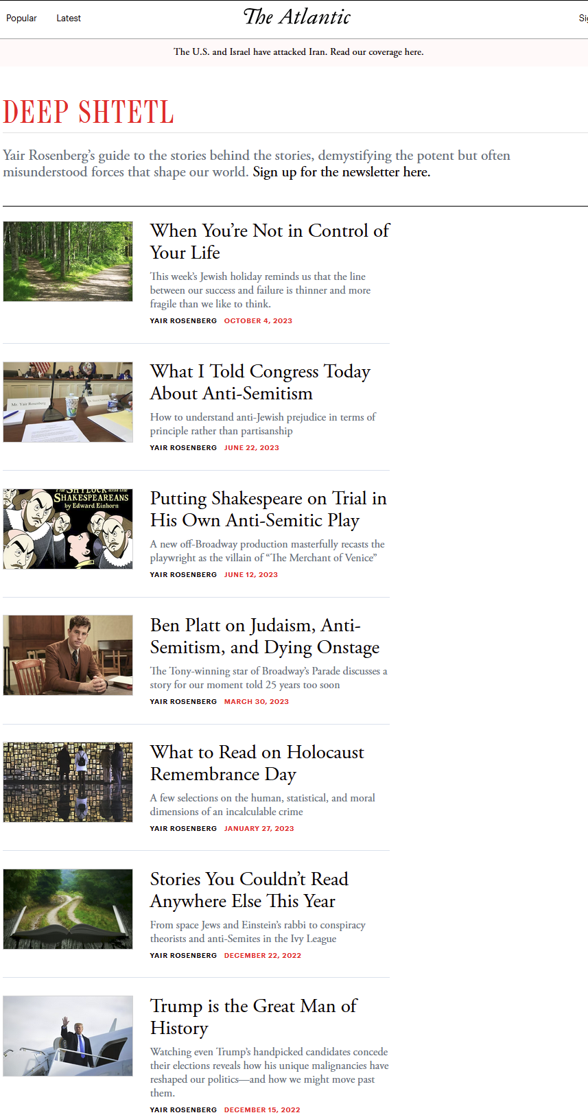 >In November 2021, he moved to The Atlantic, and launched a newsletter called Deep Shtetl,[25] where he continued his coverage of politics, culture, antisemitism, and social media dynamics, including an exploration of how a Jewish character came to be on the cult classic sci-fi show Firefly,[26] the story behind the Hanukkah menorah used by Vice President Kamala Harris,[27] interviews with celebrated Jewish authors and artists like Dara Horn[28] and Ben Platt,[29] a profile of Israeli prime minister Yair Lapid,[30] and a deep dive into Albert Einstein's little-known 20-year friendship with Orthodox rabbi Chaim Tchernowitz.[31]And such great hits like "Trump is the Great Man of History"
