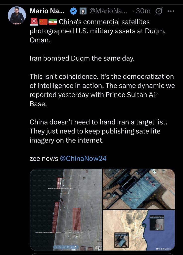 >Important Links:https://www.flightradar24.com/https://www.marinetraffic.com/en/ais/home/centerx:52.7/centery:26.8/zoom:7https://www.defconlevel.com/https://oilprice.com/https://www.pizzint.watch/https://eam.watch/https://www.gmcmap.com/index.asphttps://firms.modaps.eosdis.nasa.gov/map/#d:24hrs;@54.2,31.0,7.1zhttps://globe.adsbexchange.com/