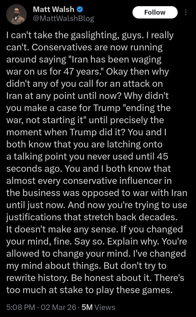 <Latest Trump:>“I don’t have the yips with respect to boots on the ground — like every president says, ‘There will be no boots on the ground.’ I don’t say it,” Trump said after launching strikes Saturday to decapitate Iran’s military and political leadership. “I say ‘probably don’t need them,’ [or] ‘if they were necessary.'”>“It’s going to go pretty quickly,” he said. “We’re right on schedule, way ahead of schedule in terms of leadership — 49 killed — and that was, you know, going to take, we figured, at least four weeks, and we did it in one day.”>“We’re already substantially ahead of our time projections, but whatever the time is, it’s OK, whatever it takes, we will always and we have from right from the beginning.>“We projected four to five weeks but we have capability to go far longer than that. Operation Epstein Fury started on February 28 2026