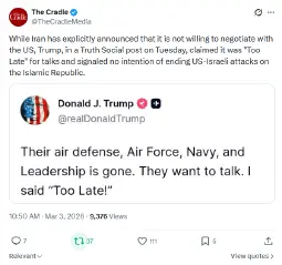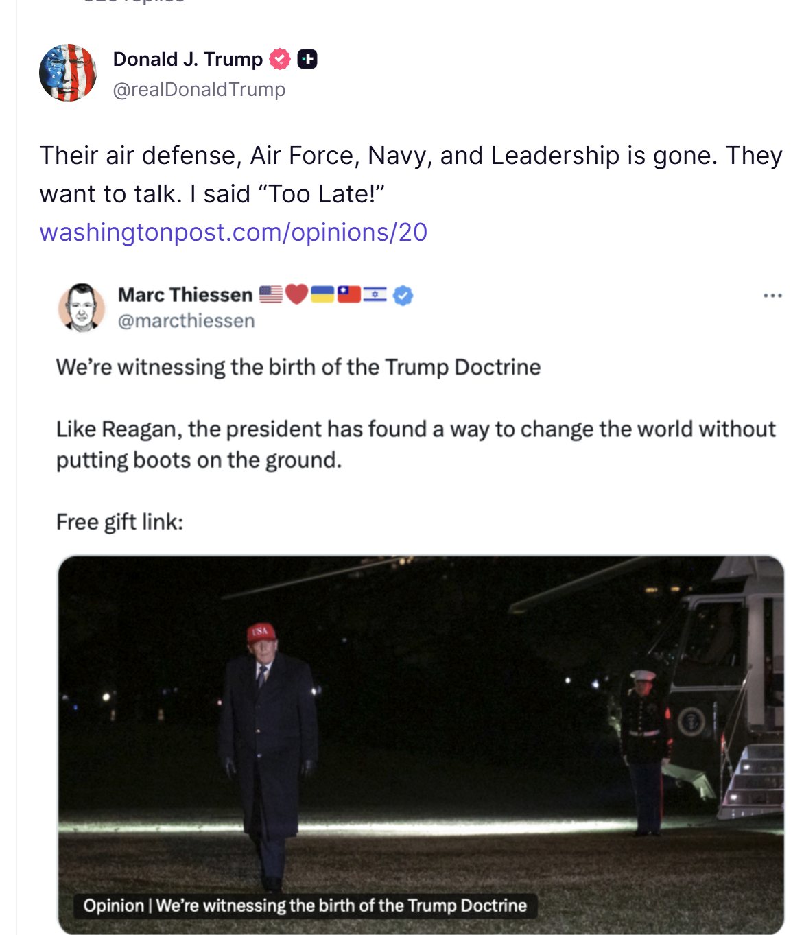 Trump realized he fucked up, so he plays the big guy. When he says he's ready for a "forever" war (in scare-quotes in the original) what he means is that he doesn't want one. When he says "no more negotiations" he means "plz someone pull me out of this shit."