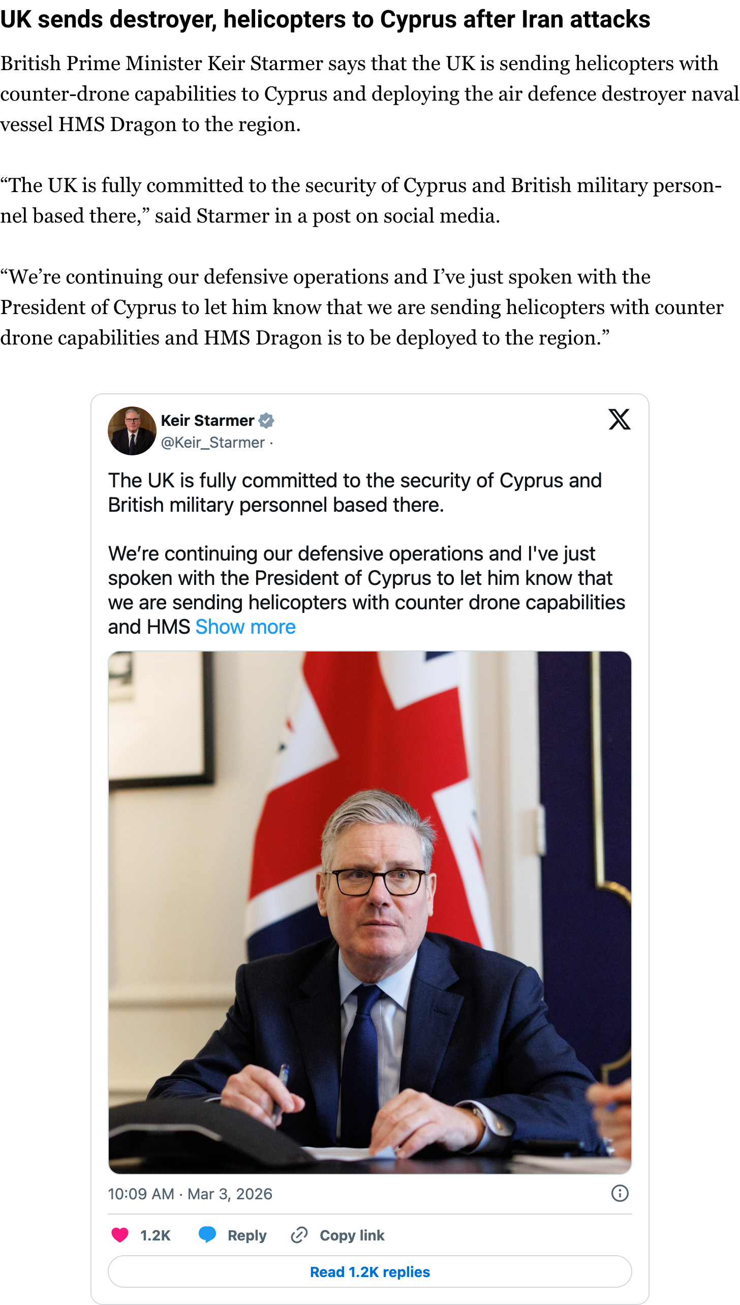 “The UK is fully committed to the security of Cyprus and British military personnel based there,” said Starmer in a post.