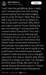 Also, the funniest aspect is that he basically added like two dozen new items to his daily schedule which he already complained being too ardous for him to tolerate (he just wants to play golf and have covktail parties at mara-dick-o with his Epsteinite friends). I predict that he will allow the pentagon to basically autopilot the mess he created after a week, but then he will realize that he created a mess (Iran war) to cover up the previous mess (Epstein files) so he will have to create a third mess (probably fucking someway with the midterms) because the only thing he's afraid of is losing the popular vote. He's a sore loser like that who can't cope with having a "bad image" that's why he lost the plot the last time he lost the vote.