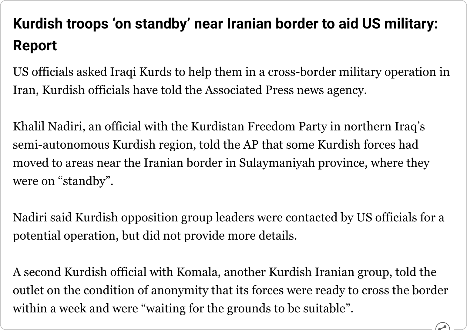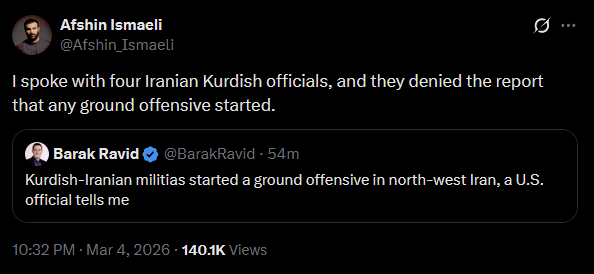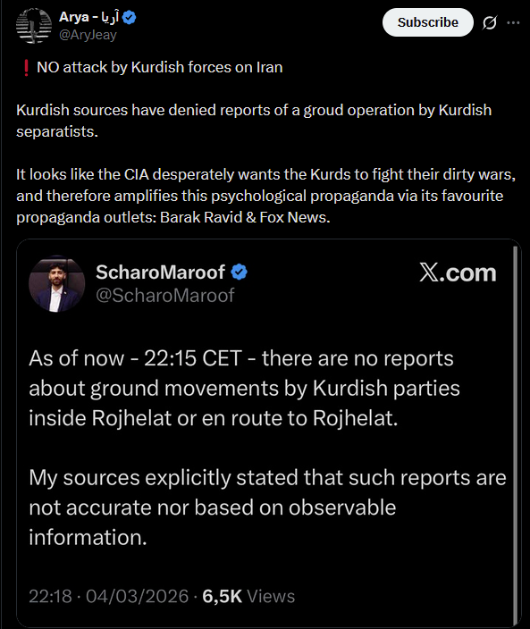 Only thing that has happened is KRG Peshmerga have positioned themselves on the border. This is likely a disinfo campaign to draw IRGC forces into Rojhilat, for yet unknown reasons.