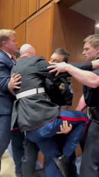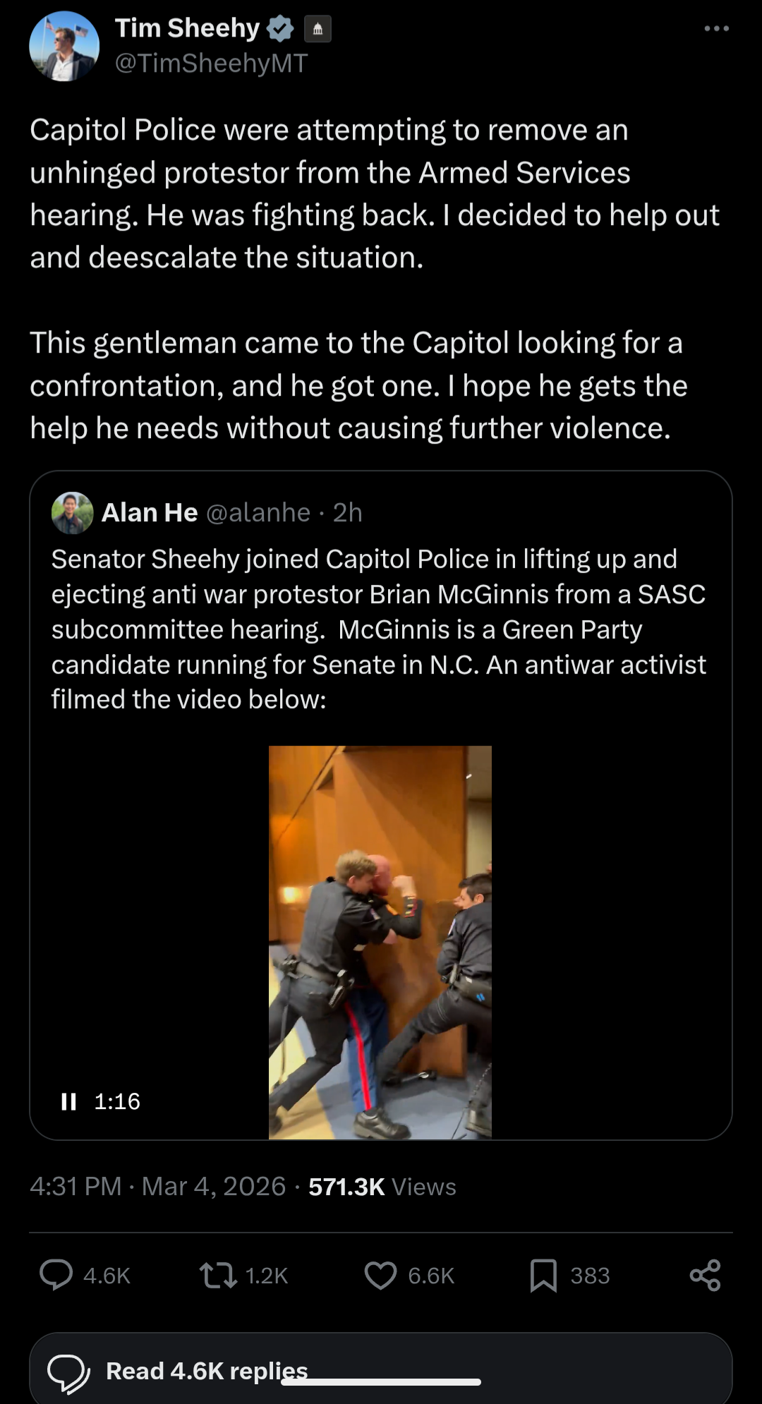 A wild moment unfolded in the U.S. Senate on Wednesday as Senator Tim Sheehy (R-MT) joined the Capitol Police in tossing an anti-war protestor from a Armed Services Subcommittee hearing.